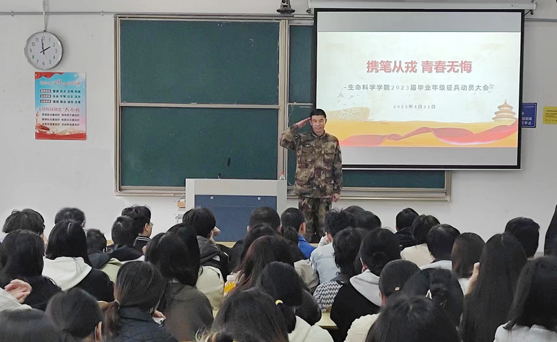 4月23日下午,生命科学乐竞体育-中国一站式服务官网召开2023届毕业生年级征兵动员大会暨基层就业政策宣讲会。校人武部张青国老师应邀作征兵政策宣讲。