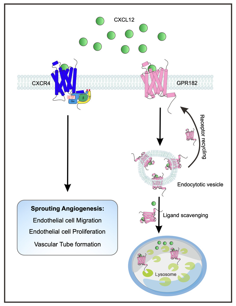 血管新生是指从已有血管形成新血管的生理过程,其在胚胎发育以及肿瘤进展等过程中均发挥着重要作用。以肝癌为代表的高血管化肿瘤,往往展现出强烈的血管新生活性。肿瘤内部密集且紊乱的血管网络会阻碍化疗和放疗等治疗手段的疗效,原因在于药物可能无法充分渗透至肿瘤内部。寻找新的血管新生调控因子用于治疗高血管化肿瘤有很高的必要性。该研究团队通过分析肝癌病人组织样本特点,结合单细胞和转录组测序手段发现,肝癌组织中GPR182表达显著下调,且其表达水平与血管密度呈负相关。利用斑马鱼动物模型以及体外培养的血管内皮细胞结合遗传学和分子生物学实验手段证实GPR182参与调控内皮细胞增殖和迁移。随后实验发现,GPR182作为清除受体介导趋化因子CXCL12的内吞降解,进而调控胞外CXCL12水平。肝癌模型中抑制CXCR4-CXCL12信号通路可显著改善血管异常表型。本研究为治疗肝癌等高血管化肿瘤提供了新的治疗策略。