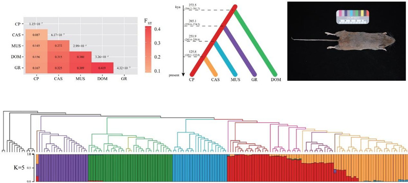 小家鼠是实验小鼠的祖先,包含世界范围内邻域分布的三个主要亚种(M. m. domesticus,  M. m. musculus, M. m. castaneus)。之前研究显示,印度北部是小家鼠亚种分歧中心,但中心群体的具体分布区一直未确定。在青藏高原第二次科学考察期间,研究组从尼泊尔西南部和西藏自治区吉隆盆地采集到32Mus鼠样本,对其进行了全基因组测序。结合该属不同物种的全基因组数据进行了系统基因组学研究。研究不仅确定了我国与巴基斯坦、我国与印度接壤地带为小家鼠中心群体分布区,还发现尼泊尔西南部样本属于中心群体与M. m. castaneus亚种过渡类群,而吉隆盆地的样本代表该物种的新亚种(命名为M. m. gyirongus)。分化时间推算提示,吉隆新亚种与M. m. domesticus M. m. musculus分化时间接近,约25~27万年前相继从中心群体分化,而M. m. castaneus13万年前才分化出来,亚种分化时间对应于不同的间冰期阶段。吉隆亚种与中心群体分歧之后,基因组内与细胞周期调控与癌症发生、生殖与胚胎发育(尤其神经突触的结构与功能)以及外源刺激免疫反应密切相关的基因经历了正选择。吉隆新亚种的发现有助于更全面理解小家鼠种内分化历史,还为生物学和生物医学研究提供了新的地域特色遗传资源。